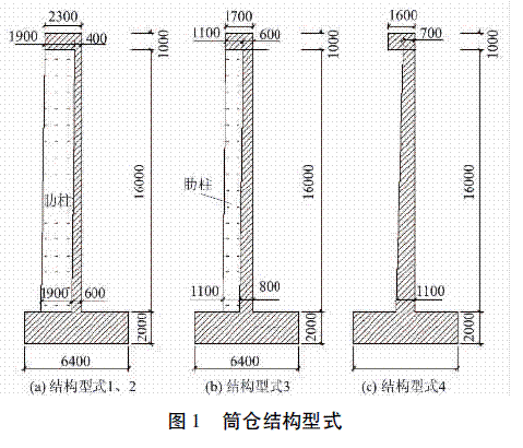 在考虑筒仓上部结构与地基基础相互作用的前提下,分析了季节温升与温降和堆煤引起的筒仓内外壁温差、煤压等主要荷载对筒仓结构的影响,得到了不同荷载作用下筒仓结构的受力规律,弄清了不同荷载对筒仓结构作用的机理。据此,对目前工程中用到的整体式筒仓进行了一定的优化,得到了更合理的筒仓结构型式。 仓壁环向不设竖直方向的伸缩缝,充分利用仓壁环向钢筋承担煤压力的整体式贮煤筒仓[1-2],能有效减小仓壁的截面尺寸、桩基基础的工程量,从而获得巨大的经济效益,因此,最近在建或已经建好的筒仓大多数采用的是整体式筒仓结构,而不是传统的分离式筒仓。国内已建成的整体式贮煤筒仓其仓壁为变厚度的壳体,仓壁底端厚为1 m 左右,顶端厚0. 7 m 左右,仓壁厚度线性变化,底部和顶部分别有承台和环梁,无刚性底板,有些在仓壁外侧每隔一定距离设置肋柱,加强筒仓的侧向刚度。 国外学者也对筒仓进行了深入研究。文献[3]~[7]研究了筒仓与煤的相互作用、煤颗粒在仓壁上产生的侧压力分布规律。Abdel-Fatta 等[8]用有限元分析了仓壁内力与壁厚、底板刚度的关系,采用3结点的梁单元模拟筒仓、6 结点三角形单元模拟煤颗粒建立有限元模型。上述文献研究的筒仓直径一般在20 m 左右,设有刚度较大的底板,采用的是平面有限元分析,并且没有研究地基基础对结构受力的影响。 由于季节温升与温降,堆煤产生的筒仓内外壁温差、煤压引起场内土层不均匀沉降等因素,使得筒仓的受力比较复杂,为了弄清筒仓在上述荷载作用下的受力规律及不同荷载对筒仓结构的作用机理,本文在已有的整体式筒仓基础上,采用三维有限元分析了基础与上部结构共同作用下的筒仓受力,根据其受力特征,对整体式筒仓做了一定的优化,得到了更为合理的结构形式。本文具体分析了4 种筒仓结构型式: 结构型式1 为薄壁,仓壁底部厚600 mm,顶部厚400 mm,筒仓厚度线性变化,环向每间隔10度设置断面为1200 mm × 1900 mm 的肋柱,顶部环梁横截面为2300 mm × 1000 mm; 结构型式2 与结构型式1 尺寸不同之处在于其仓壁底部在无肋柱处与承台断开; 结构型式3 的仓壁底部厚800 mm,顶部厚600 mm,肋柱断面为1100 mm × 1000 mm,环梁横截面为1700 mm × 1000 mm; 结构型式4 无肋柱,仓壁底部厚1100 mm,顶部厚700 mm,环梁横截面为1600 mm × 1000 mm。4 种结构的承台横截面均为6400 mm × 2000 mm。目前已建的整体式筒仓多采用型式3 或4,型式1 和2 是本文提出的优化结构型式,如图1 所示。